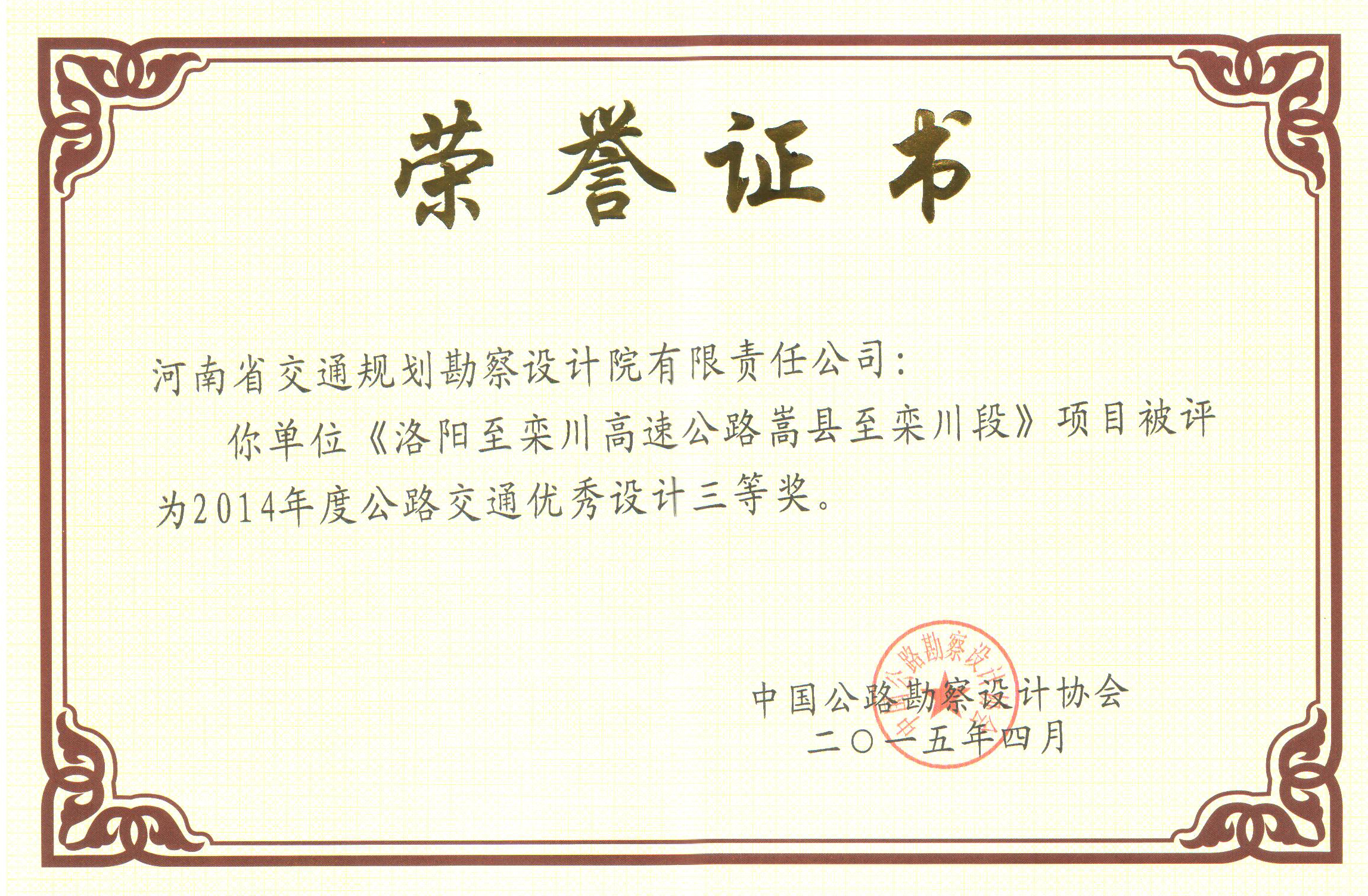 近期,我公司完成的《洛阳至栾川高速公路嵩县至栾川段》项目被中国公路勘察设计协会评为2014年度公路交通优秀设计三等奖。