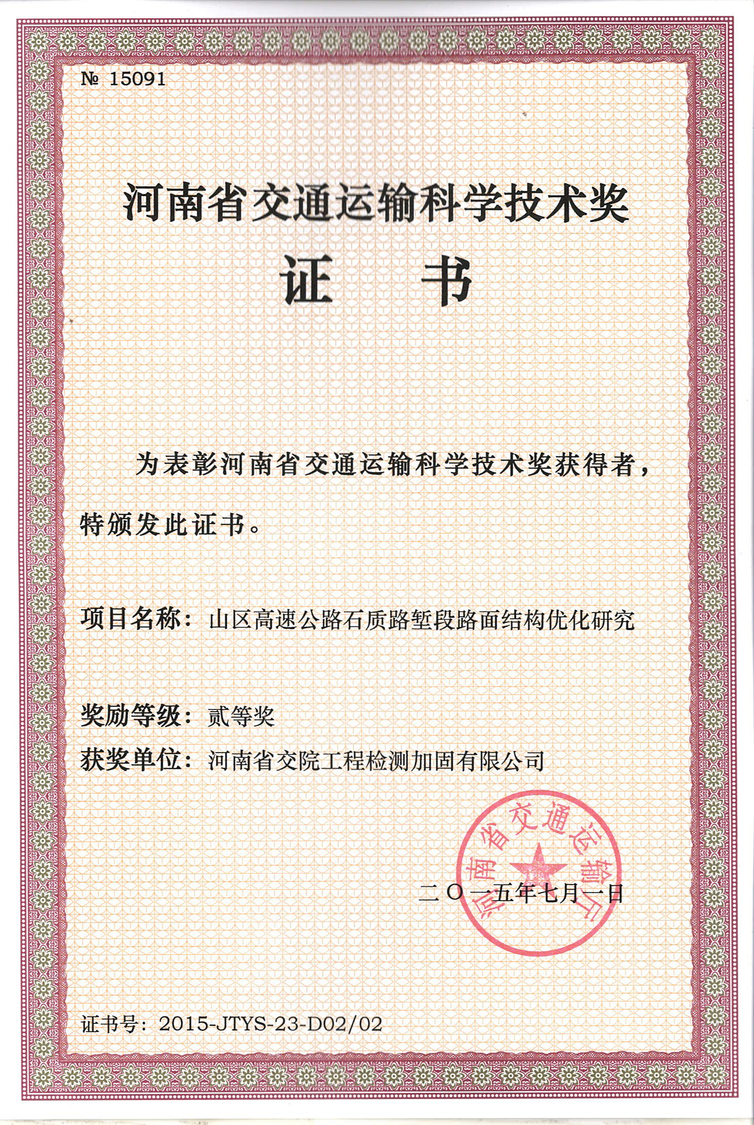 近日,公司所属检测加固公司完成的科研项目《山区高速公路石质路堑段路面结构优化研究》获河南省交通运输科学技术贰等奖。该项目根据现场试验和理论计算,提出了岩石坚硬程度大于较软岩的石质路段路基模量控制值和...