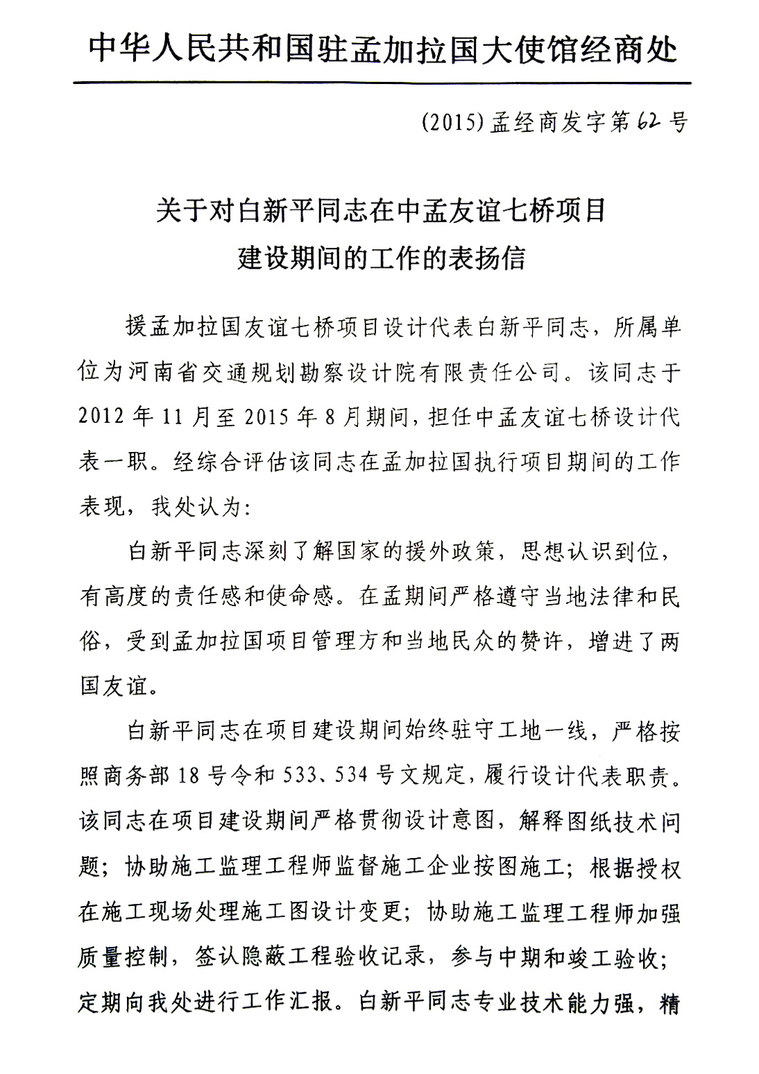 日前,驻孟加拉国大使馆经商处来函对我公司设计四院白新平同志进行表扬。来函称我公司设计四院白新平同志在2012年11月至2015年8月期间的设计服务工作中,不惧工地现场高温、蚊虫、病疫等恶劣的工作和生活条件,踏...