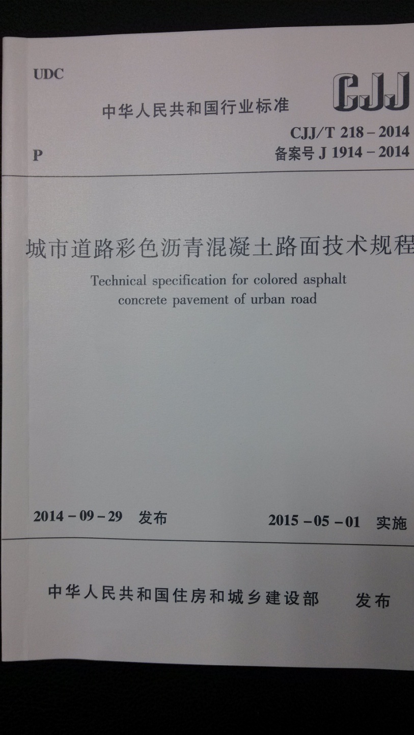 国家行业标准《城市道路彩色沥青混凝土路面技术规程》cjj/t 218-2014国家住房和城乡建设部于2014年9月29日发布,将于2015年5月1日正式实施。 本标准由国家住房和城乡建设部归口管理,我公司为主要参编单位。