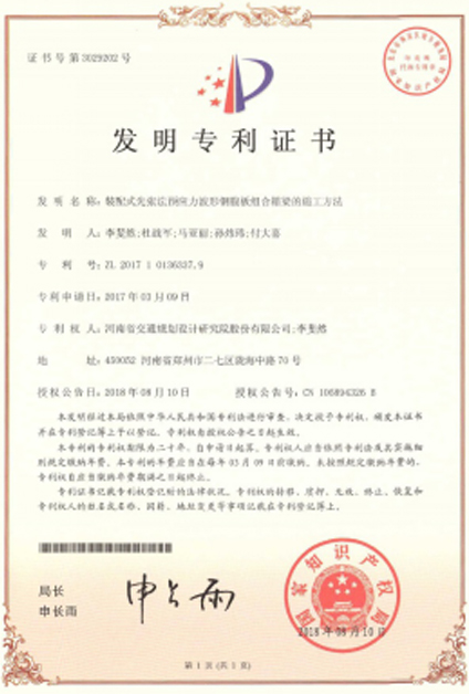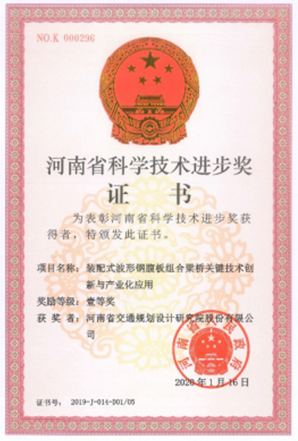 研发的装配式波形钢腹板组合梁桥具有良好的经济性与施工便捷性,符合装配化的要求与钢结构的行业导向,获2019年度河南省科学技术进步奖一等级,推广应用里程达20公里。