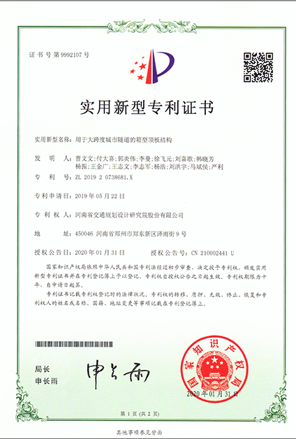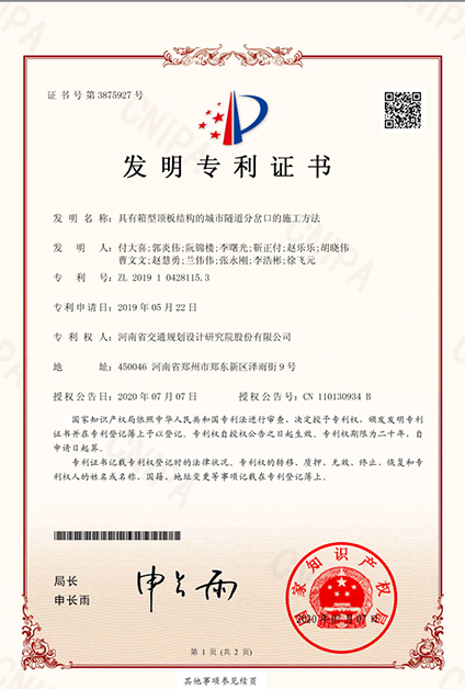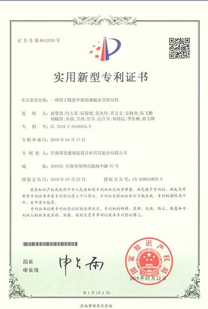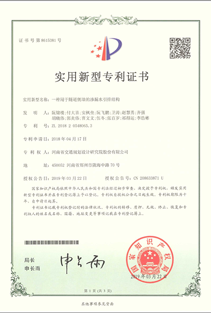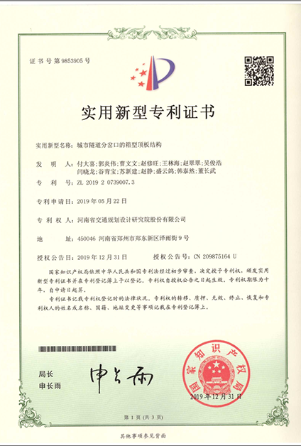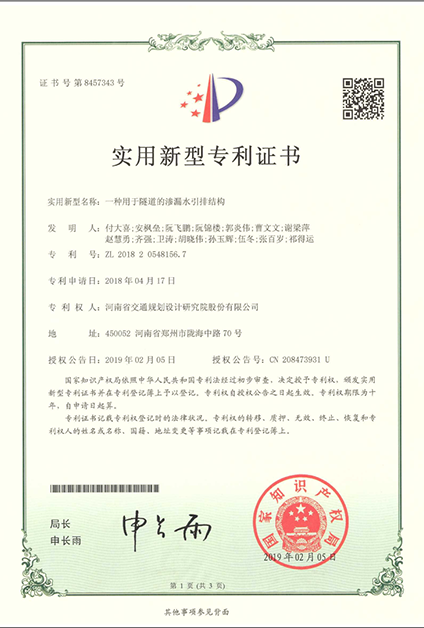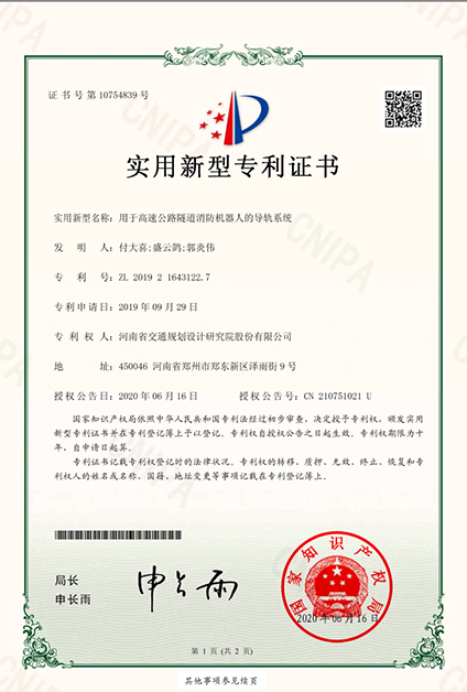 在隧道安全运营方面,融合隧道运营节能化、防灾应急迅速、智能化等主题,获得授权“用于辅助隧道竖井排风的装置”、“一种隧道用传统射流风机简易辅助装置” 、“用于高速公路隧道的消防机器人灭火系统”等国家发明及实用新型专利,获得“特长公路隧道通风斜井绘制系统”、“公路隧道通风控制数据管理系统”、“ 公路隧道通风优化数据统计分析软件”等软件著作权,满足了运营安全等级提升,行业更新发展的需求。
